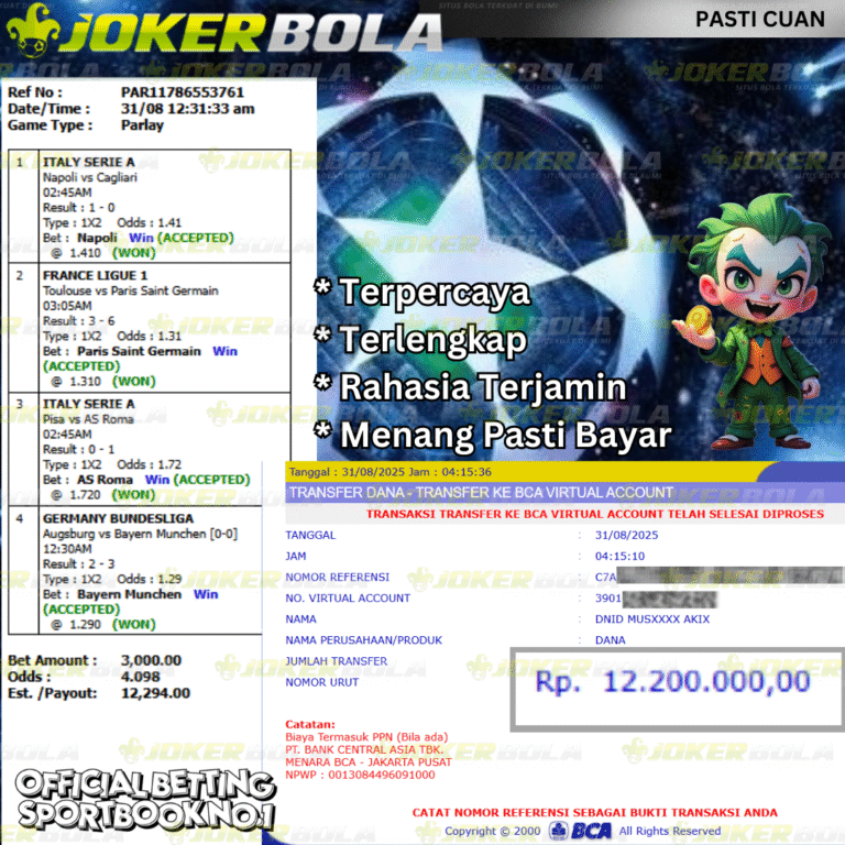 Jackpot Parlay Sportbook Rp.12,200.000 BUKTI TRANSFER JOKERBOLA Selamat kepada Sahabat JOKERBOLA…