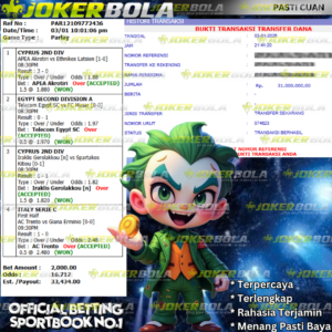 Selamat kepada Sahabat  JOKERBOLA dengan user id -Polxxxxx- telah berhasil meraih JACKPOT PARLAY pada permainan – SPORTBOOK DI JOKERBOLA – dengan kemenangan sejumlah  Rp.31,000.000.00-.Dan telah menyelesaikan kesimpulan yang di proseskan dari pihak JOKERBOLA di kurun waktu kurang dari 5 menit, Jokerbola telah selesai dan lunas melakukan transfer ke user id tersebut. Bukti pembayaran pun sudah kami bagikan dan dapat dipertanggungjawabkan atas proses transaksi SAH yang diperoleh dari bukti transaksi dibank yang terkait.
