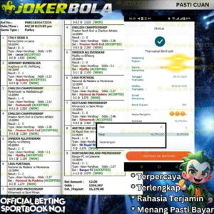 Selamat kepada Sahabat  JOKERBOLA dengan user id -PAxxx08- telah berhasil meraih JACKPOT PARLAY pada permainan – SPORTBOOK DI JOKERBOLA – dengan kemenangan sejumlah  Rp.16,278.000.00 -.Dan telah menyelesaikan kesimpulan yang di proseskan dari pihak JOKERBOLA di kurun waktu kurang dari 5 menit, Jokerbola telah selesai dan lunas melakukan transfer ke user id tersebut. Bukti pembayaran pun sudah kami bagikan dan dapat dipertanggungjawabkan atas proses transaksi SAH yang diperoleh dari bukti transaksi dibank yang terkait.